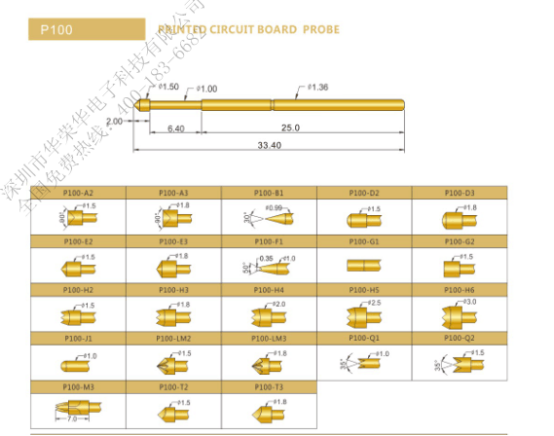 應用于PCB的測試探針規(guī)格最早的有P125、P100、P075、P50。針頭少量如:九爪頭、皇冠頭、三面錐型頭、杯型頭等。