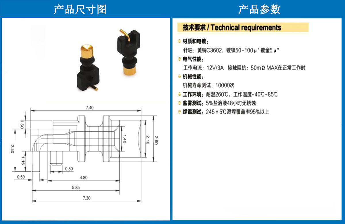 產(chǎn)品介紹:這個(gè)針通常用于智能手表,藍(lán)牙耳機(jī)上的有充電的功能,但是探針總體來(lái)說(shuō)還是測(cè)試的