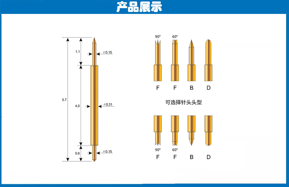 產品頭型:探針外徑為0.31mm,總長度為5.7mm、針的兩端的頭型分為爪頭