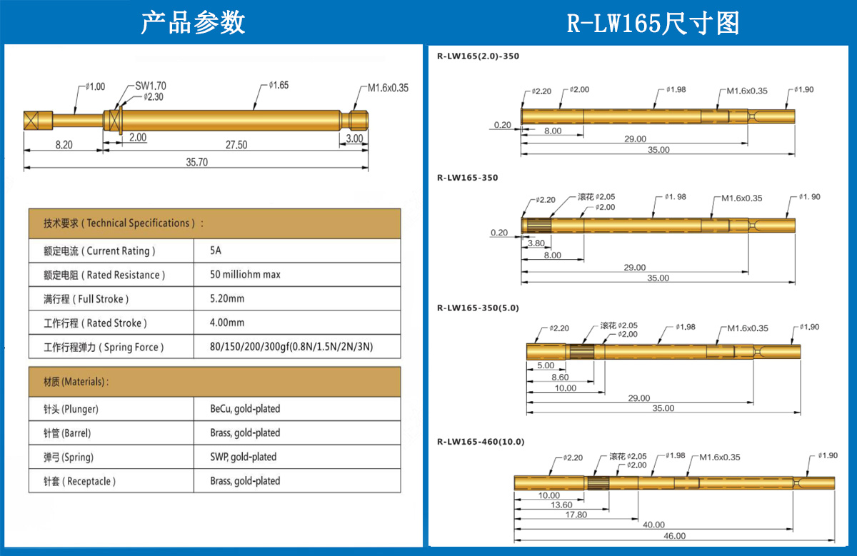 產品簡介:R-LW165線束針套,1.98mm測試針套、總長35mm、彈簧針