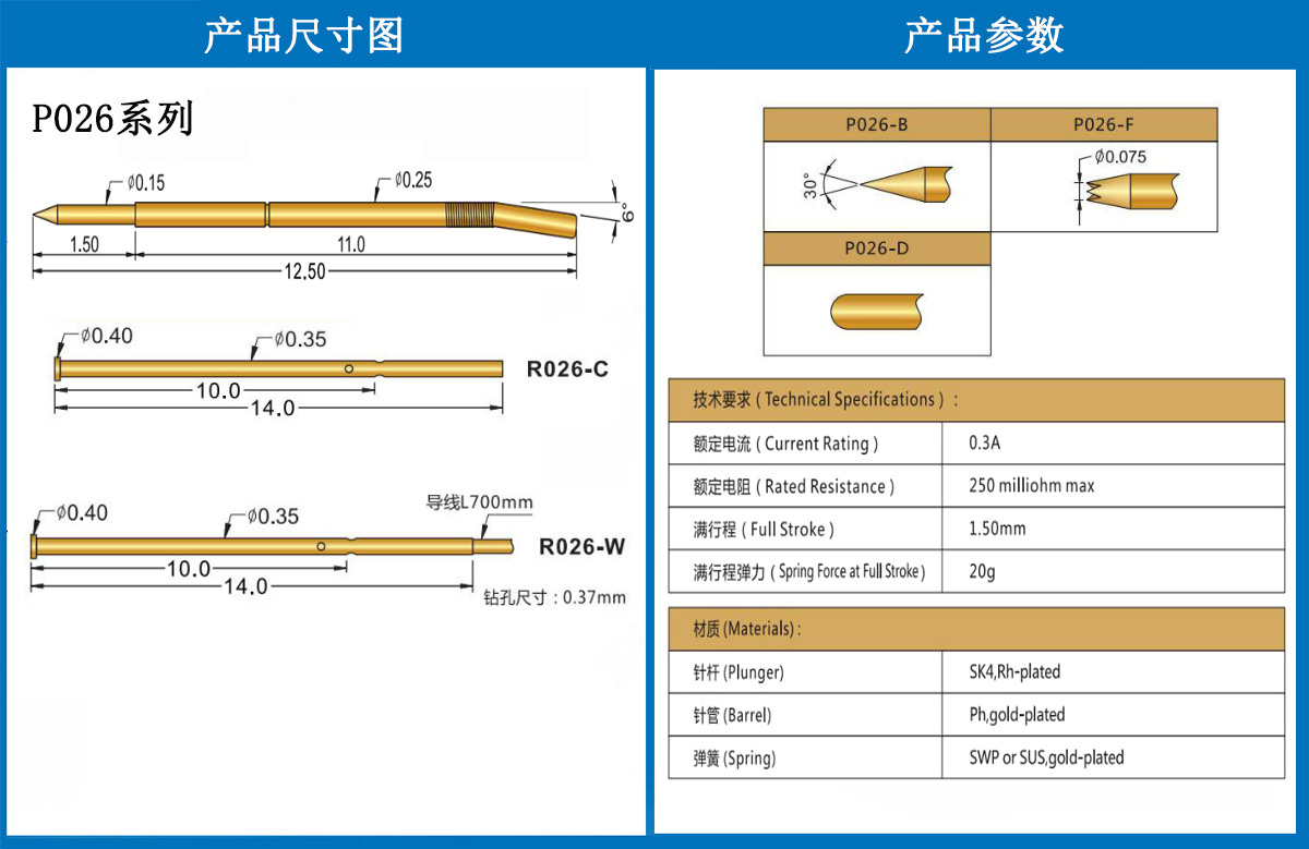 產品簡介:P026探針、0.25mm測試針,總長12.50mm、彈簧針、測試針、頂針、伸縮探針